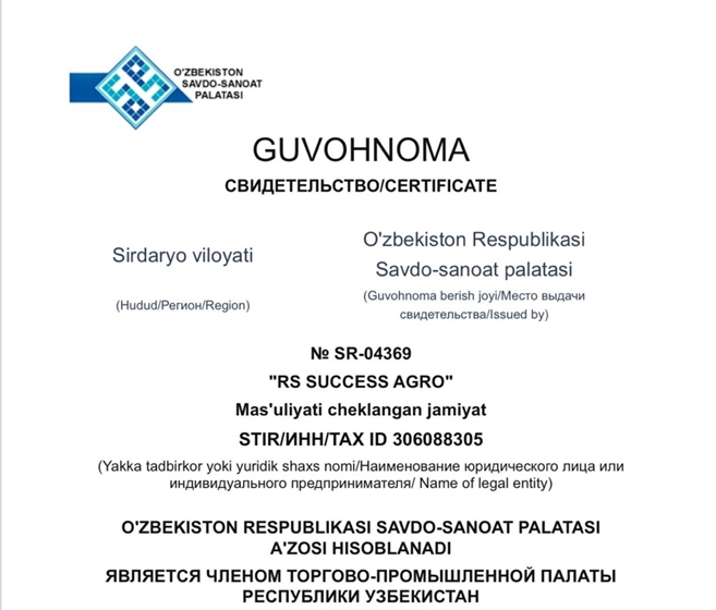 RS SUCCESS AGRO has been awarded a certificate confirming its full membership in the Chamber of Commerce and Industry of the Republic of Uzbekistan