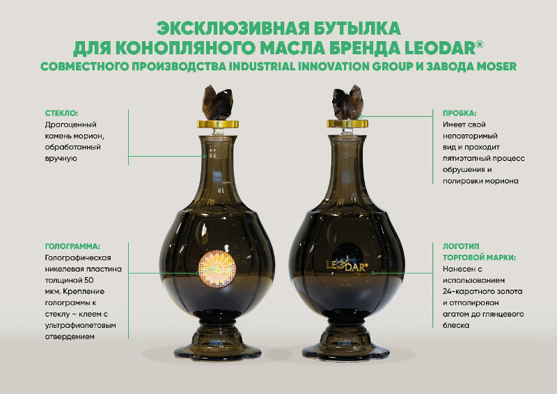 Industrial Innovation Group (ОАЭ), всемирно известный лидер в отрасли защищенной печати, и Moser – признанный королевский бренд изделий из хрусталя (Чехия), объединили свое мастерство, чтобы создать эксклюзивную бутылку из моравского хрустального стекла ручной работы для конопляного масла торговой марки Leodar®.